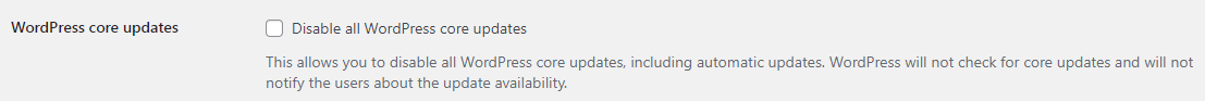 This allows you to disable all WordPress core updates, including automatic updates. WordPress will not check for core updates and will not notify the users about the update availability.