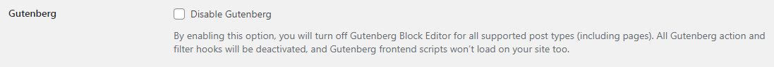 By enabling this option, you will turn off Gutenberg Block Editor for all supported post types (including pages). All Gutenberg action and filter hooks will be deactivated, and Gutenberg frontend scripts won’t load on your site too.