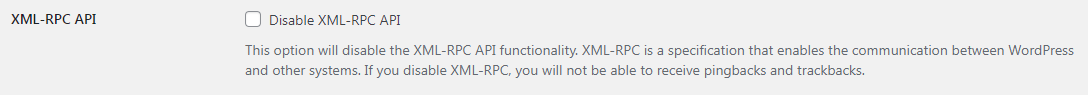 This option will disable the XML-RPC API functionality. XML-RPC is a specification that enables the communication between WordPress and other systems. If you disable XML-RPC, you will not be able to receive pingbacks and trackbacks.