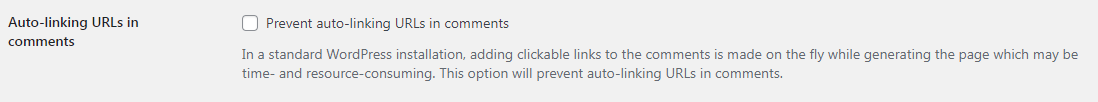 In a standard WordPress installation, adding clickable links to the comments is made on the fly while generating the page which may be time- and resource-consuming. This option will prevent auto-linking URLs in comments.