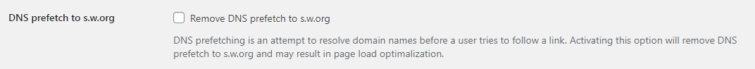 DNS prefetching is an attempt to resolve domain names before a user tries to follow a link. Activating this option will remove DNS prefetch to s.w.org and may result in page load optimization.