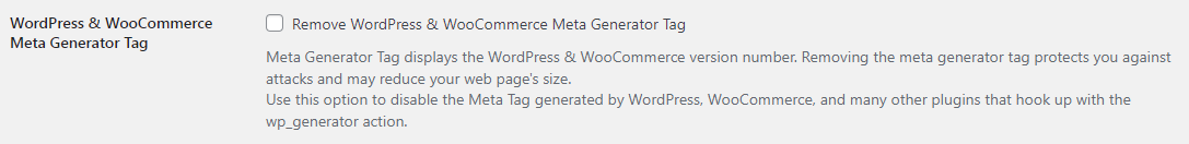 Use this option to disable the Meta Tag generated by WordPress, WooCommerce, and many other plugins that hook up with the wp_generator action.